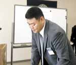 まずは、質問 Q, 8月度例会で2004年度理事長予定者と承認され今のお気持ちは? 入会6年目卒会の年に理事長に選ばれて素直に嬉しい。プレッシャーと責任をかなり感じていて来年の新年宴会ことさえ考えてしまう。自分は自分らしい理事長しかできない(それを前面に出したい) Q, 2004年度の目標は? 個人的な予定を入れない。みんな(JCメンバー)が一番大事。メンバーが自分を語るとき、恥ずかしくない理事長でありたい。 Q, 自分自身にとってJCとは? 修練、奉仕、友情。特に修練と友情のウエイトが大きい。こんなに自分を修練するすばらしい場所は他にはない。友情は、本気で語り合い喜怒哀楽を腹の底からみんなで分かち合うところがいい。 Q, JCに初めて入会して感じたことは? 例会が厳粛だったのでびっくりした。異業種の人と話したり飲んだりするのがとても新鮮だった。利益もないのに一生懸命活動する姿がとても好きになった。 Q, 萩青年会議所会員に一言メッセージを みんなの力を結集して一緒にがんばりましょう。 |