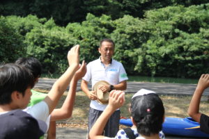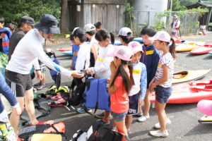 ライフジャケットを着用して、陸でカヌーの漕ぎ方を教えてもらいます。