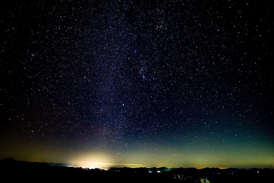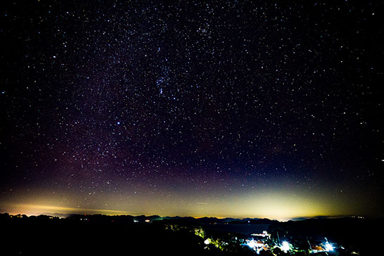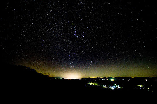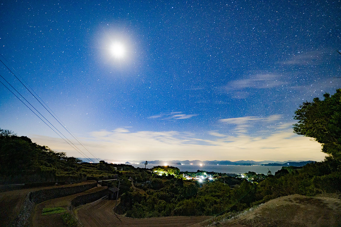 <調査員のコメント> 港から灯台に向かう道中にあるだんだん畑からの星空は微かに見える萩市内の街灯り相島の風景がマッチしたポイントでした。
